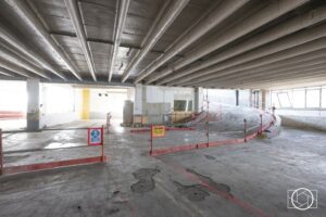 La complexité de l’opération a mobilisé l’ensemble du savoir-faire du Groupe Legendre. La reprise en sous-œuvre, réalisée avec injection au sol, a permis de sécuriser les fondations de l’ouvrage existant, condition essentielle à toute transformation de cette ampleur. Le renforcement de la structure en béton armé a ensuite rendu possible l’extension du bâtiment, suivie d’une surélévation spectaculaire de six niveaux supplémentaires au-dessus du 2ème niveau, pour atteindre une hauteur totale de huit étages. À terme, cette opération offrira plus de 8 300 m² de surface habitable.