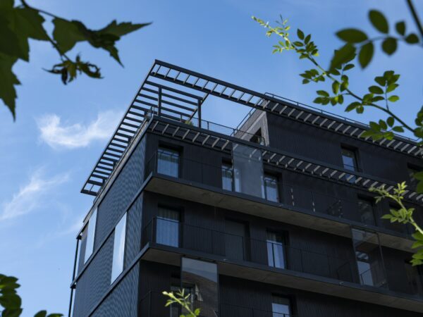 - Façade en béton matricé lasurée gris anthracite